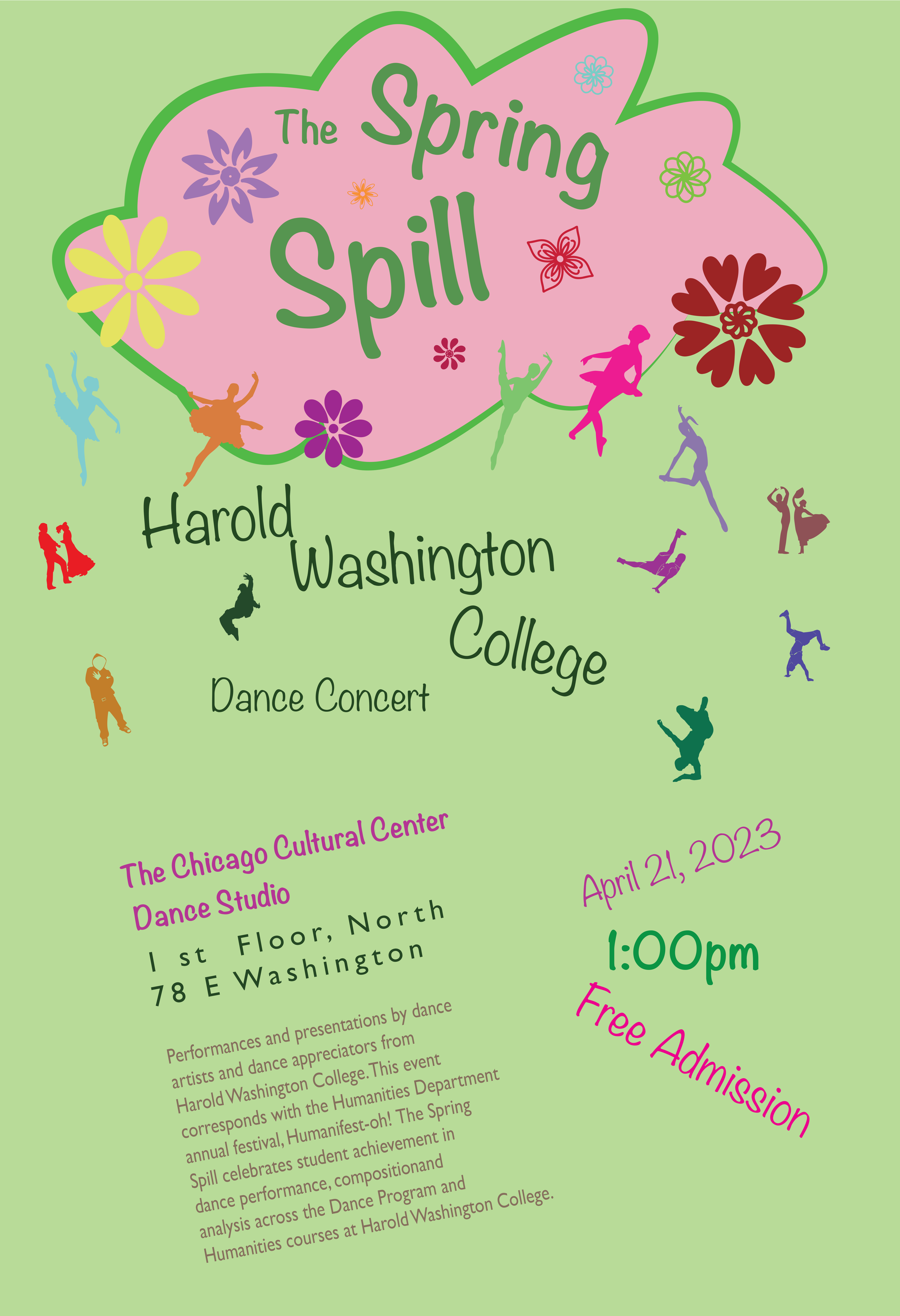 This poster was a dance concert hosted by Harold Washington College called “ The Spring Spill”. I chose vibrant colors that radiates energy and creativity. The designs feature a spring theme with a green color and floral designs. I made the title in a bubble shaped that attracts attention. Then, paired it with a simple font for the important information like location and time. I liked to used the combination of bold fonts, vivid colors, and whimsical imagery that invites the audience to come an see this dance concert.
